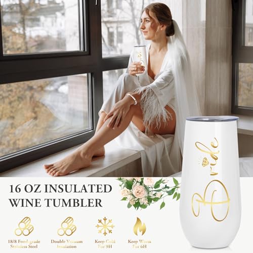 Champagne Tumbler Cup & Ring Finger Wine Glass: Deze 16 oz wijnbeker is goed ontworpen met “Bride” afdrukken, voorzien van dubbele vacuümisolatie en een BPA-vrij onbreekbaar deksel. Ringvinger wijnglas is gemaakt van dik, high-density borosilicaatglas, dat stevig, licht is. Ze kunnen binnen of buiten worden gebruikt voor wijn, koffie, thee, melk, sap, water enzovoort, geschikt om koude en warme dranken te houden, ideaal voor vrijgezellenfeest