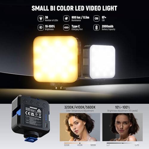 【Mini bi-kleuren LED-videolamp】 10 helderheidsniveaus, instelbare kleurtemperatuur van 3200K tot 5600K en een hoge CRI van 97 voor nauwkeurige kleurweergave. Aangedreven door een ingebouwde oplaadbare batterij van 2000 mAh met uren continue verlichting voor binnen of buiten.