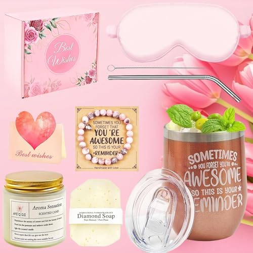 Pamper cadeauset: de cadeauset voor vriendin bevat 360 ml geïsoleerde wijnbeker met roestvrij rietje, reinigingsborstel, geurkaars, handgemaakte zeep, zijden oogmasker, prachtige armband, wenskaart en een geschenkdoos om je warme verzorging te tonen.