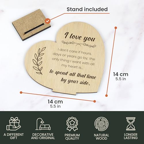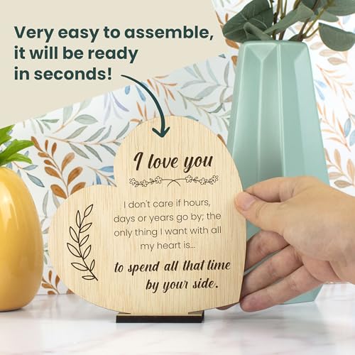 INCLUDES A WOODEN SUPPORT: Includes a base so you can decorate your living room, your kitchen or your office with this heart-shaped card with pretty phrases