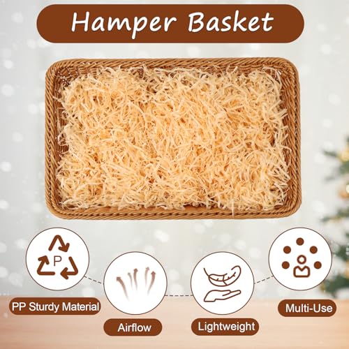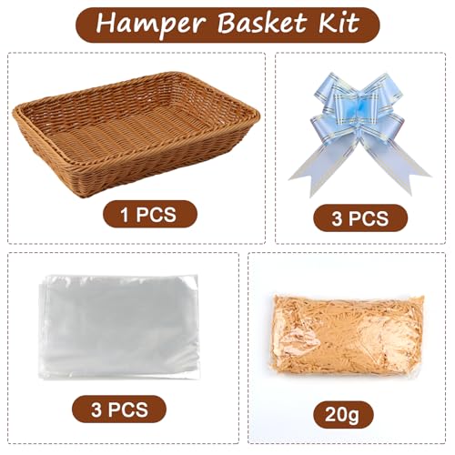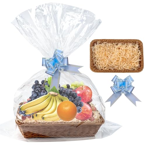 Perfecte set: Deze mand mand kit bevat 1 koffiekleurige geschenkmand + 3 blauwe strikken + 3 transparante geschenkzakjes + 1 pak champagnekleurig versnipperd papier, wat handig is om zelf decoratie te maken en je eigen schattige geschenken te maken.